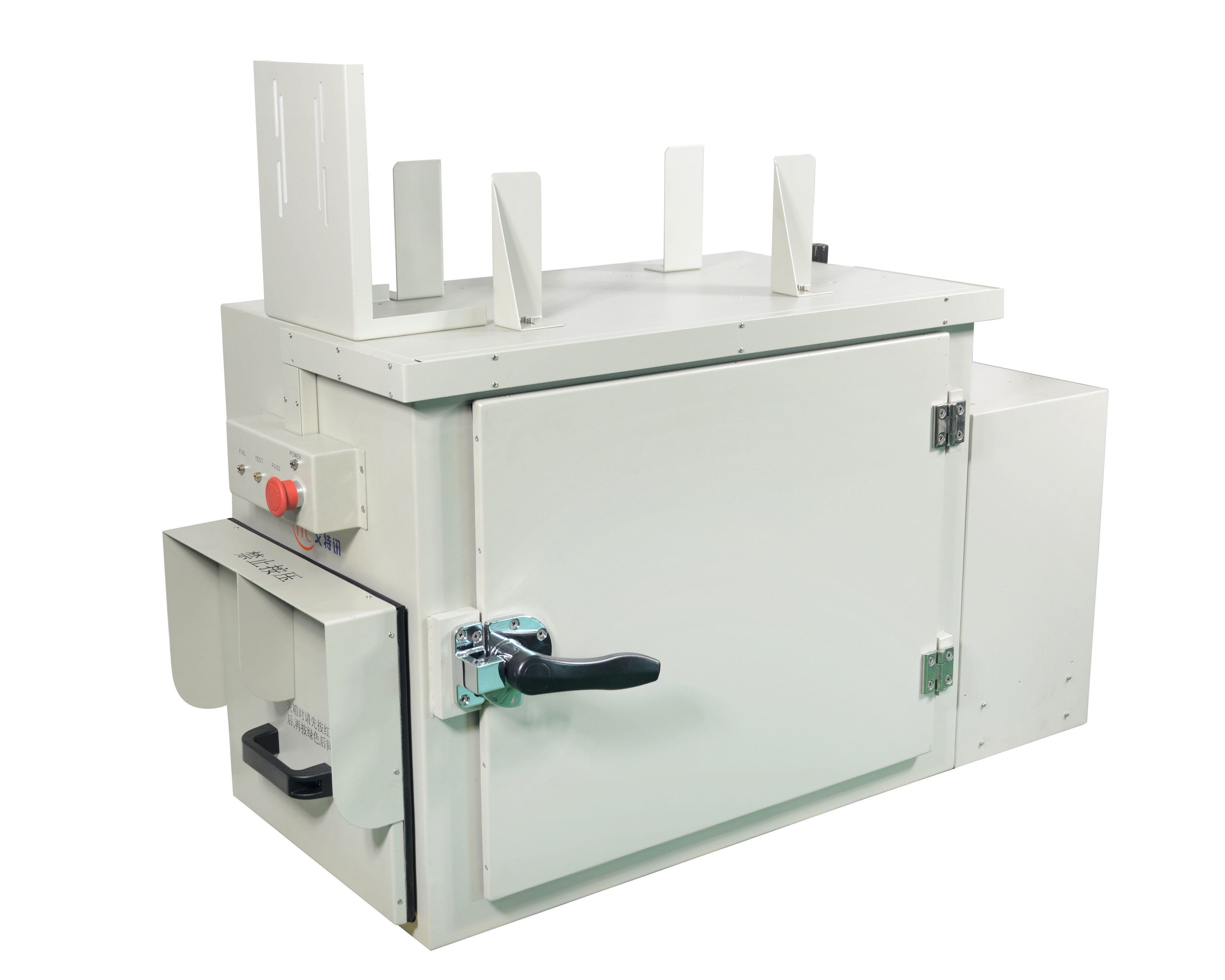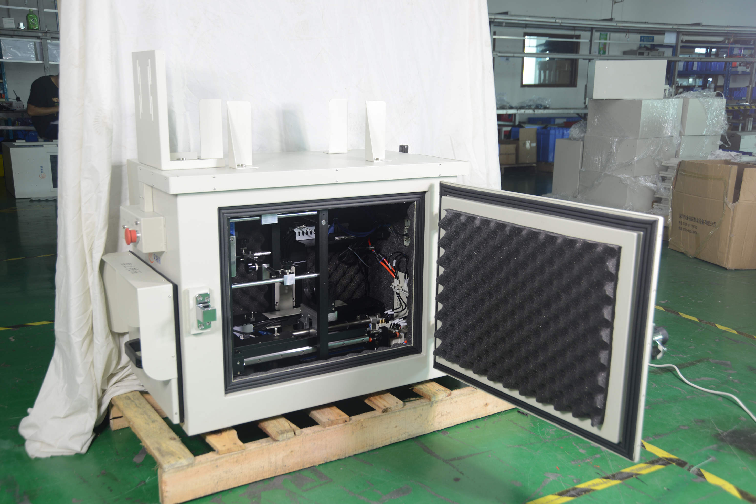 a kind of pneumatic soundproof boxThe speaker is welded with sheet metal material. It has the advantages of light weight, high strength, good sound insulation and tightness, and firm structure. The interior adopts multi-layer high-quality sound insulation and absorption materials and leading assembly technology to ensure the quality of the product. It is suitable for audio test of wireless communication devices such as mobile phones. The utility model has the advantages of simple operation and labor saving, and is an economic and practical sound insulation box at present.